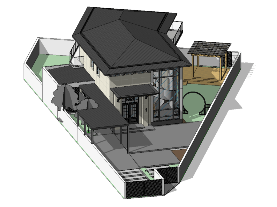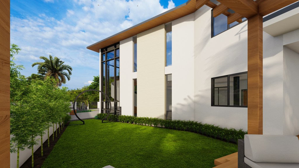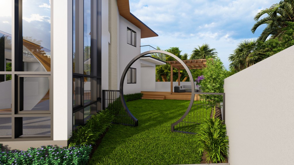 The house’s central feature is of course, its garden. Flanked by a lawn on the Southwest side of the site, guests can comfortably convene surrounded by greens with shade in the morning and gentle sunset light in the afternoon. Entered from the front by its powder-coated steel moon gate, or from the rear by the outdoor dining area, the garden caters to the client’s request for outdoor activity space for children and adults alike.