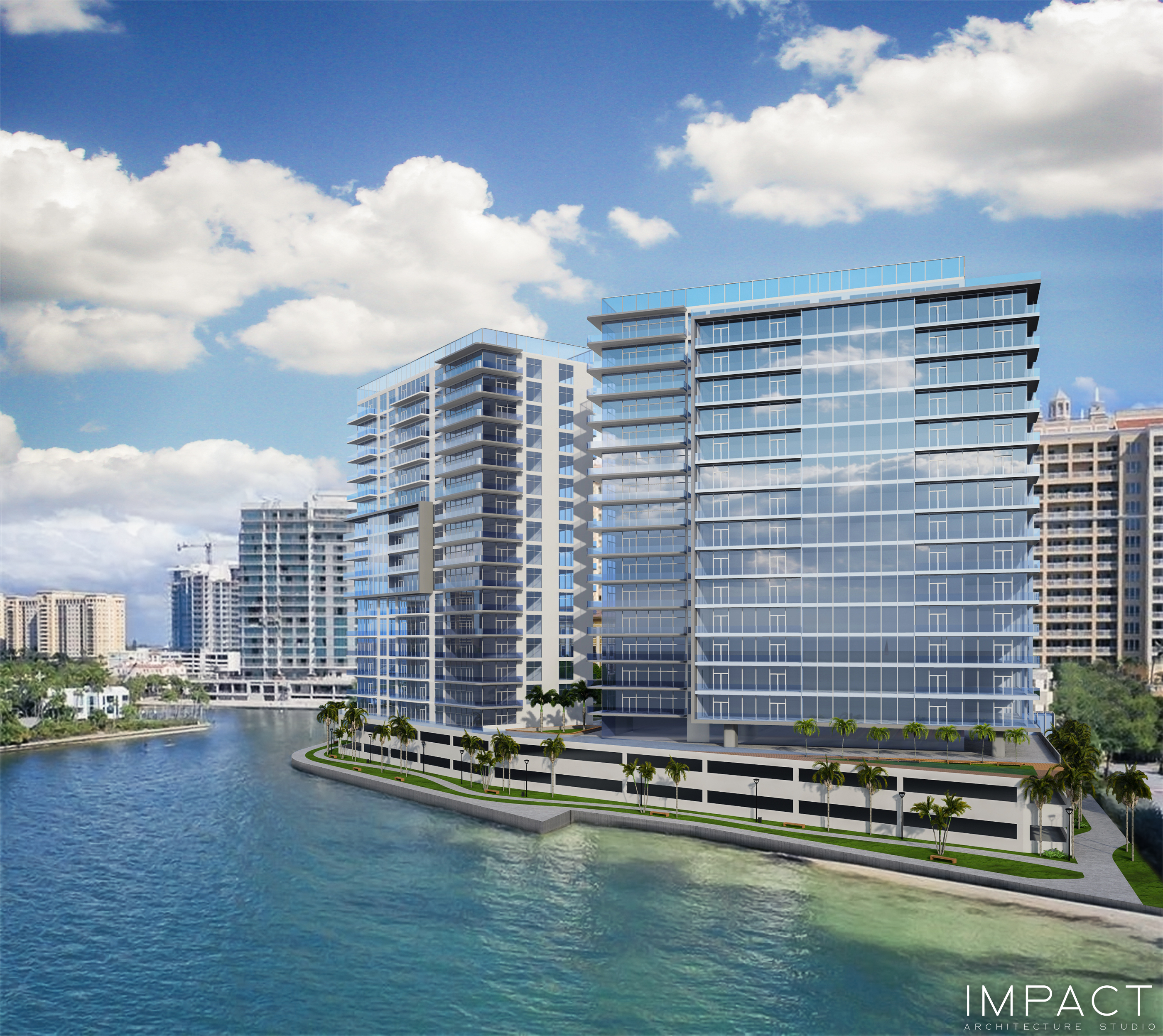 One of the main challenges with this design was, apart from applying the local codes and setbacks, maintaining views and vistas for other towers. The design brief called for a simple, modern two-tower development on a parking podium with amenities. The condominiums will offer stunning views of the bay as well as multiple other shores in the distance.